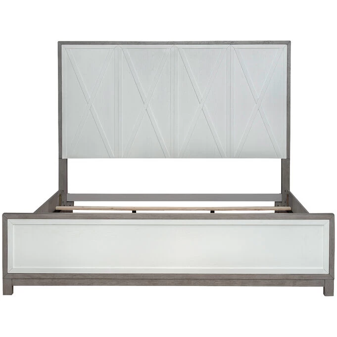 Bring a new level of casual sophistication to your home with the stunning Palmetto Heights Panel Bed. Carefully crafted with rubberwood solids and split heart cathedral white oak veneers, this beautiful bed features a stylish two-tone Driftwood and Shell White finish. The two-tone finish exhibits the best of casual contemporary style with a unique picture frame molding outline accented by X-panels in the headboard. The footboard mirrors this detail with picture frame molding outlining the wood-framed center panel, allowing the theme to flow throughout the piece. The Palmetto Heights Panel Bed goes well with farmhouse, coastal, cottage core and shabby chic design styles.