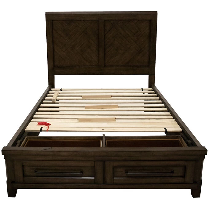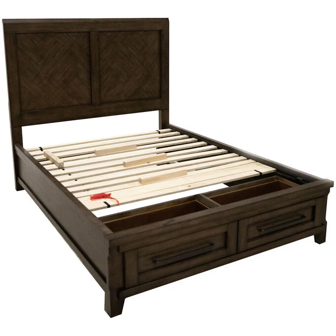 Seek out the Patches panel storage bed when you’re ready for sophistication and elegance in your bedroom. It’s made of solid rubberwood for durability, but the oppositely laid white oak veneers show off this bed’s rustic style. The headboard is set with an inlaid geometric pattern for additional flair, and the rails are bolted on for stability. The low-rise footboard has two cedar-lined drawers for extra storage and cloth protection. Tapered feet and squared-off corners enhance the contemporary feel of this exceptional panel storage bed.