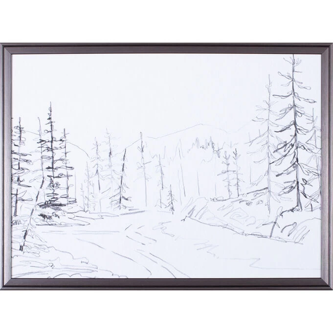 Art Effects presents a piece from their Catalog Collection featuring a sketched snowscape in a framed presentation. Resting inside a quality resin frame, this ready-to-hang artwork by Emma Caroline is a perfect accent to any home. The abstract forest setting sketch features mountains, pine trees, and snow blanketing the surrounding area. This forest piece resides in a black frame, which has dimensions of 30” in width and 22” in height. There is no assembly required for this item. Shop this scenic design from Art Effects and other small artwork at Slumberland. If you’d like to see any of our art collections hanging in person, stop by a showroom today.
