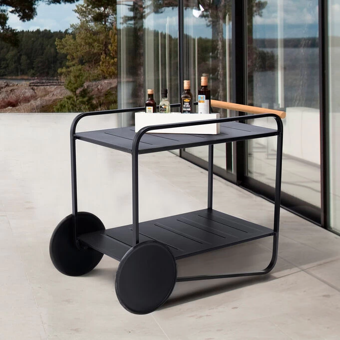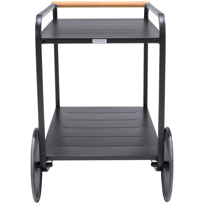 Entertain on your patio like a pro with this Armen Living Portals Outdoor Accent Cart with Wheels in Black Frame Finish and Teak Natural Wood Accent. Powder-coated aluminum ensures the frame of this cart stays sturdy yet lightweight for maneuverability, and teak wood accent handle adds natural beauty to the top while making this wheeled bar cart water- and weather-resistant for lasting outdoor or indoor use. The Armen Living Portals collections features outdoor sofas, chairs, dining and bar stools and dining and occasional tables. This Portals Outdoor Accent Cart with Wheels is available in a Black Frame Finish and Teak Natural Wood Accent. – Product Details provided by Manufacturer, Slumberland not responsible for errors in information.