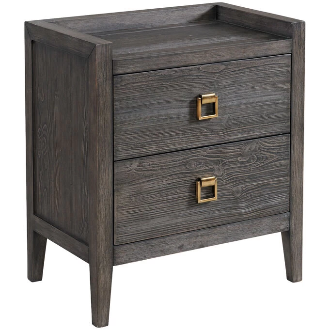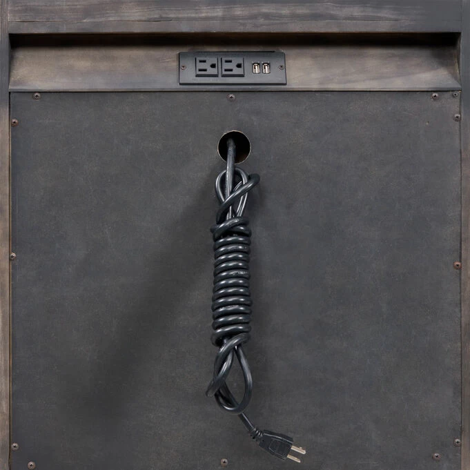 Full of refinement and style, the Portia Nightstand will bring a sense of elegance to your bedroom. From the heavily wire brushed dark spruce finish with silver undertones to the angular ring pulls with an antique gold finish, every detail adds to the overall elegance of this nightstand. USB Ports and outlets that keep tables, phones, and other devices charged and ready to go and two cedar-lined storage drawers add to its functionality and practicality. In addition to the pleasant natural aroma of cedar and its ability to keep insects away, these drawers remove moisture from the air and help keep mildew at bay.