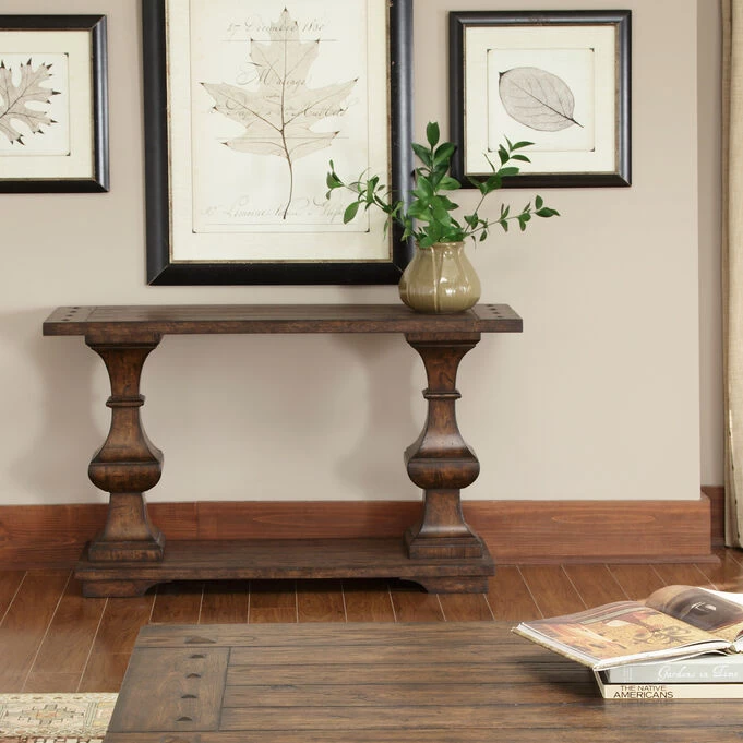 Perfectly sized to fit behind the sofa, the Rancho Sofa Table features turned legs with a stunning heavy planked top and detailed square peg accents. The bottom shelves give plenty of room for storage and to display collectibles and knick-knacks. Its rich brown finish is the perfect accent for leather furniture. It goes with any neutral color palette and can serve as an anchor to brighter ones. This gorgeous piece of furniture is right at home with a variety of design styles, including farmhouse, transitional or boho. In addition to the living room, this piece works well in the dining room or entryway.