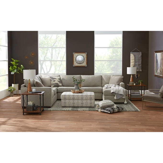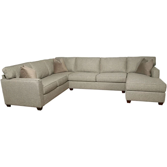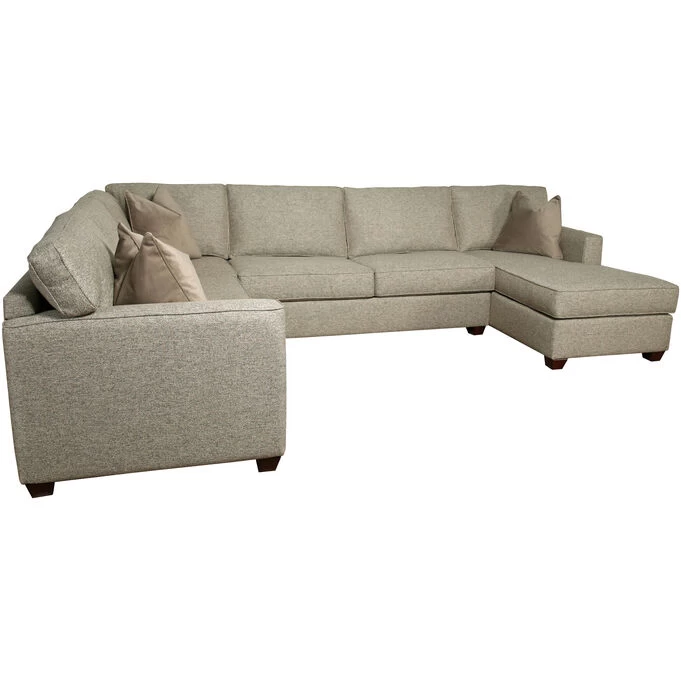 The Rise 3 piece sectional with right chaise brings just the right blend of simple, modern design and indulgent comfort. Offered in a chic shade of neutral gray, it comes with its own feather-filled accent pillows. This quality sectional has a hardwood and plywood frame that is corner blocked, stapled, and glued for durability. The back cushions feature channeled chambers filled with virgin polyester fiber, and foam core seat cushions are wrapped with Dacron polyester. Bring a whole new level of comfort to your living space with Rise.