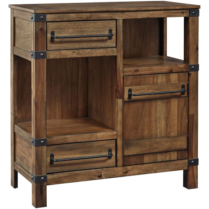 The Roybeck accent cabinet was designed to complement your contemporary rustic décor. It’s farmhouse chic with an industrial accent. This storage console merges drawer and cabinet storage with open display space, giving you lots of options for nearly any room in the house. The woodgrain finish has an inlaid effect, and oversized industrial hardware adds attitude. The door compartment has one adjustable shelf. This accent cabinet is made of acacia veneers, wood and engineered wood.