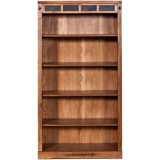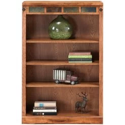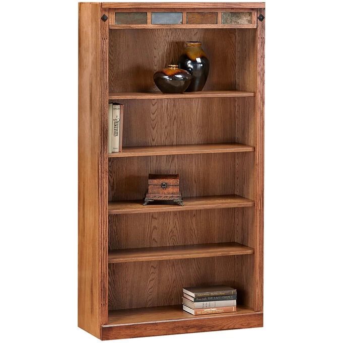 The Sante Fe 60″ bookcase will add just a touch of Southwestern flair to your farmhouse or traditional décor. The smooth finish and rounded corners soften the rustic look of slightly distressed hardwood and veneers. This bookcase has four slate accent pieces above four adjustable shelves for a unique style. Add the 60″ bookcase to other Sante Fe pieces for a look you won’t soon tire of.