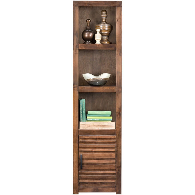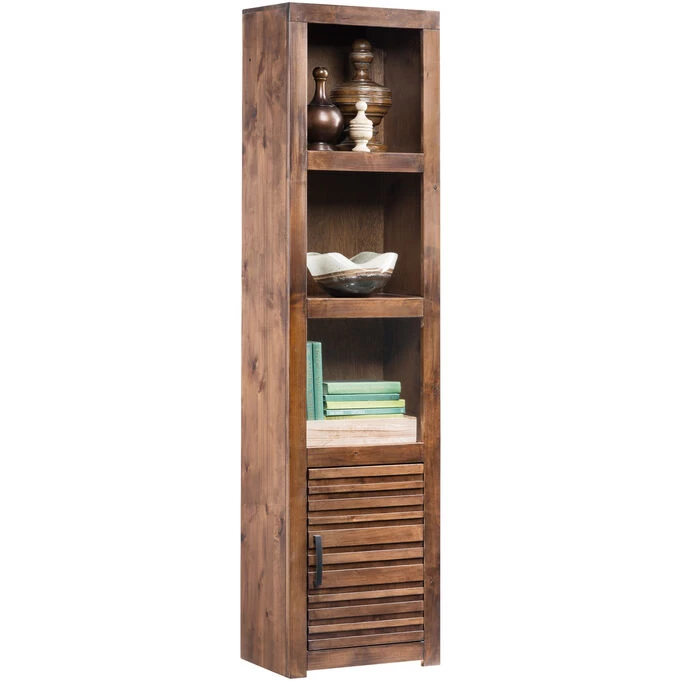 The Sausalito right pier adds storage anywhere in your home. Use it in the dining room, entry way or living room. Or pair it with the left pier and/or the console for a stylish media center. This shelving unit blends modern and rustic influences for a charming, one-of-a-kind look. Made of knotty alder solids and veneers, with a heavily distressed finish, the lower door has horizontal slat detailing for an interesting twist. European hinges and a matte metal pull add a sophisticated touch.