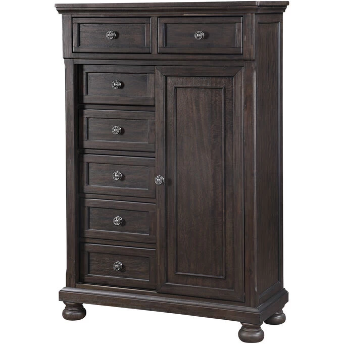 Enhance the traditional style of your bedroom with the Sophia gentleman’s chest. The framed drawers and antique bronze hardware knobs give a touch of elegance, while the felt-lined top drawer and cedar-lined lower drawers match them for practicality. This bedroom chest, made of both solid woods and veneers, can be configured in two ways—close the large side door and use the 5 available drawers, or move the door left and have open shelving. The perfect solution to your storage needs.