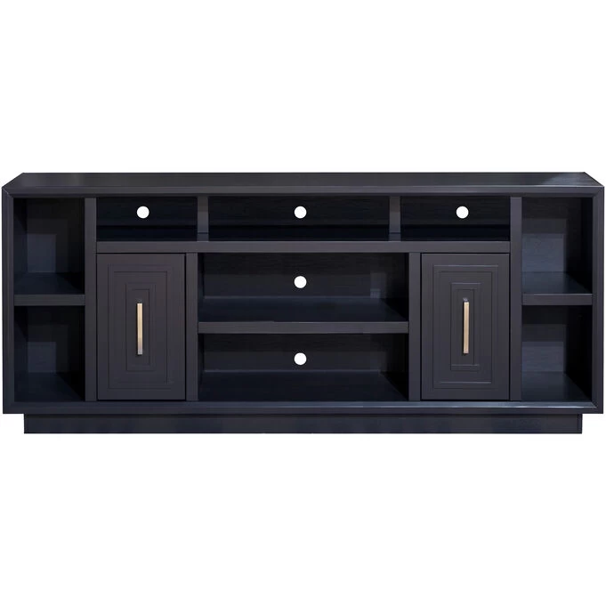 Legends Furniture has done it again with this stylish, durable, and supremely practical television, stereo, and gaming console. With no less than five compartments for electronics and multiple shelves for display and cabinets, you can organize all of your home entertainment times. Because it’s 83″ wide, it can support the largest flat-screen TVs and even have extra room on the top deck for decorative items. Game in style and enjoy the contemporary panache of this stately piece of entertainment furniture made for today’s homes. The backboard has multiple ports for cable management. Order yours today from Slumberland!