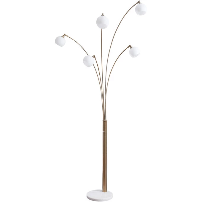 Why settle for ordinary? Feel free to bend the rules with Taliya Floor Lamp. This stunning metal arc floor lamp brings style and grace to your home décor. Equal parts sculpture and function, this striking floor lamp wows with its champagne-colored metal frame and beautiful white marble metal base. Five staggered-height lights with glass globe shades send warm illumination throughout your space. Its subtle beauty works well with a number of design styles, including modern, contemporary, eclectic and traditional. A modern take on mid-century design, the Taliya Floor Lamp is ideal for living rooms, bedrooms, guest rooms, home offices and reading nooks.
