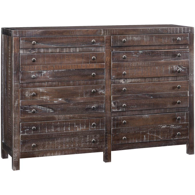 The Townsend dresser is rustic at its best! The roughhewn look is perfect for an industrial, modern farmhouse, or cabin-inspired bedroom. It features solid hardwood construction with heavy saw marks emphasized by the proprietary 9-step finish, including a glaze to highlight the natural wood grain. The shallow top drawers with their removable felt liners are perfect for storing delicate items, with the map-drawer effect repeated with faux parting rails on the larger lower drawers. Add other pieces from the Townsend collection to create your ideal room.