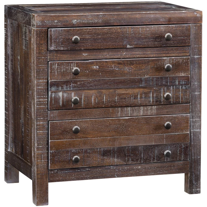 The Townsend nightstand is rustic at its best! The roughhewn look is perfect for an industrial, modern farmhouse, or cabin-inspired bedroom. It features solid hardwood construction with heavy saw marks emphasized by the proprietary 9-step finish, including a glaze to highlight the natural wood grain. The shallow top drawer is perfect for storing delicate items with the map-drawer effect repeated with faux parting rails on the larger lower drawers. Add other pieces from the Townsend collection to create your ideal room.