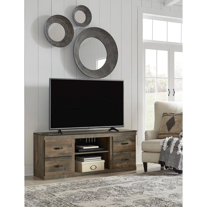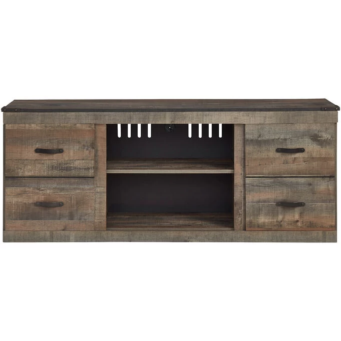 More than a TV stand, a console is a multitasking piece of furniture every family room needs. Whether you use a center console to display our television or mount one on the wall above it, you need some place to organize streaming devices, games and cables. Trinell Rustic Plank 60-Inch Console is that place. The plank-style details and rustic finish are inspired by reclaimed barn wood. The nailhead accents and metal banding give the console an urban industrial look and feel. Rugged yet with a refined sense of style, the ultra-clean lines of the Trinell Rustic Plank 60-Inch Console fit into industrial, farmhouse and transitional designs.