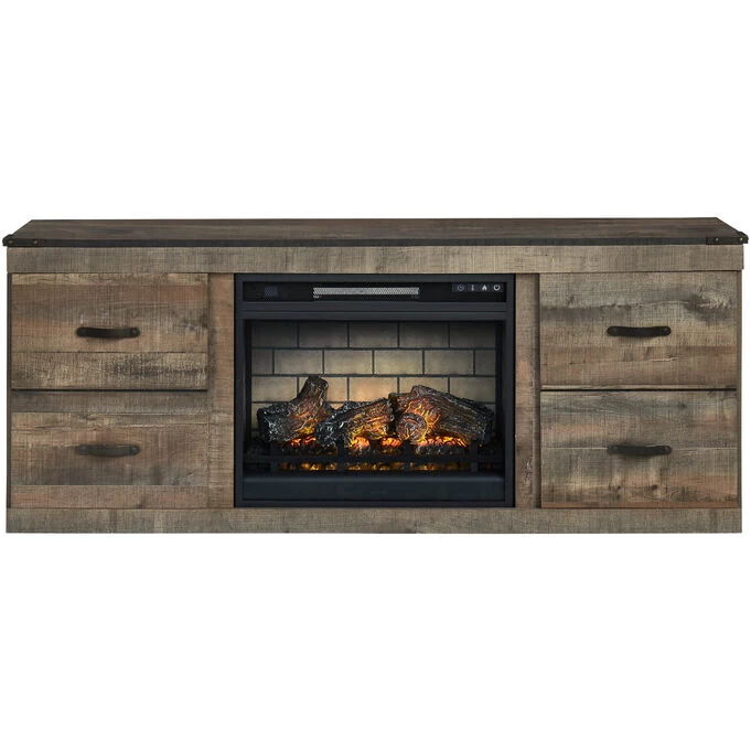 With an oak grain rustic plank finish and black iron fixtures, the Trinell 60 Inch Fireplace Console will add a sense of style and ruggedness to any living room. Its broad surface can accommodate even the largest television sets, and the ample drawers and storage compartments provide plenty of storage for gaming consoles and remote control or two. The electric fireplace adds a touch of industrial cool to the overall presentation. The LED fireplace insert does not produce heat and is a low draw on your power bill. Check out the clean lines and barnwood details of the Trinell 60 Inch Fireplace Console at Slumberland today.