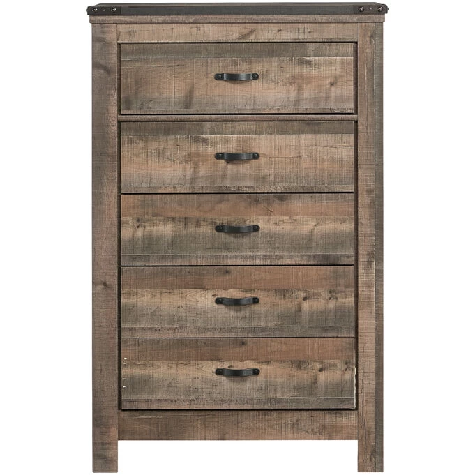 The Trinell chest brings a new kind of country charm to any bedroom. Made of replicated veneer and engineered wood, this 5 drawer chest is accented with burnished metal hardware and nailhead trim for a modern look you (or your kids) will appreciate. The wood has unique variations in color that enhance its rugged, hand hewn look. Add the rest of the Trinell collection and create a relaxed, down-home atmosphere in your bedroom.