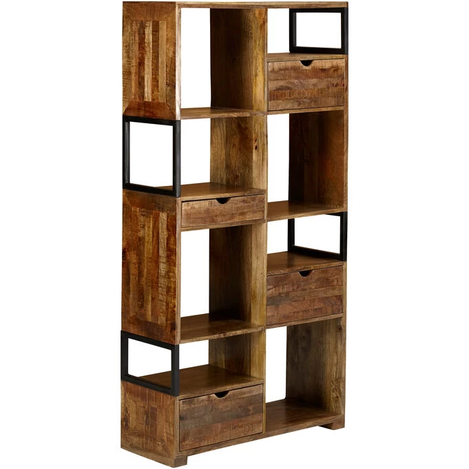 Organize your books, music collection, office supplies, and other knickknacks on this cleverly-designed Cubist shelving unit/ room divider. Constructed from a combination of hand set strips of vintage wood and new mango timber, this versatile unit provides tons of storage and charming rustic character. Keep any room tidy and organized with eight built-in shelves and four functional drawers. The black powder coated iron “spacers” add an eye-catching touch that works beautifully to help this piece fit in with almost any aesthetic.