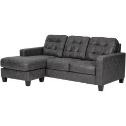 This ultra-contemporary sofa sleeper invites you to spread out and make yourself comfortable. Linear track arms offer a clean, sleek aesthetic, while tufted box cushions are a nod to mid-century design. Rest assured, a movable ottoman and reversible seat cushions allow you to place the chaise on either side for the perfect fit. Gunmetal gray faux leather offers the cool, weathered look you love and touchably soft feel you crave. Pull-out queen mattress in quality memory foam comfortably accommodates overnight guests. – Product Details provided by Manufacturer, Slumberland not responsible for errors in information.