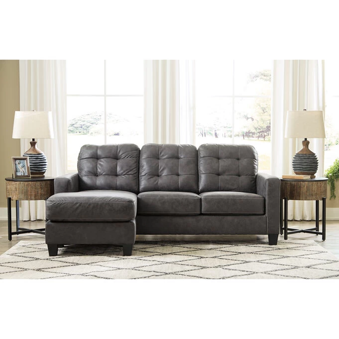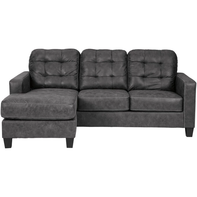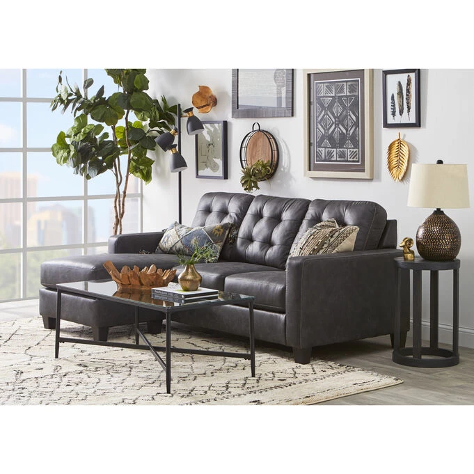 The Venaldi sofa chaise is sleek and simple, suitable for your modern or transitional décor. The chaise is movable—allowing you to use it on either end of the sofa (rearranging your furniture will always be easy!). The gunmetal gray leather-look fabric has a stylish, weathered look and an ultra-soft feel. Tufted box back cushions give this sofa a hint of retro style. The platform foundation system resists sagging, and high-resiliency foam cushions wrapped in polyester fiber assure both comfort and support.
