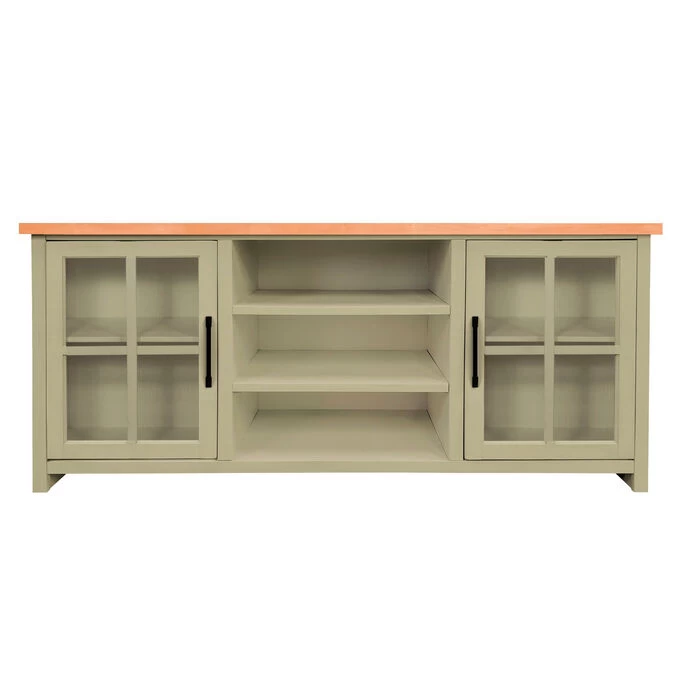 The Vineyard 71 Inch Console is a spacious storage unit designed and manufactured in the US. It offers ten storage areas for your media gear and comes in a stylish two-toned finish of Sage Green with a Fruitwood top that can give any room a fresh look. This console is perfect for holding an 82-inch TV and features cutouts that simplify cable management. The oil-rubbed hardware and glass panel doors add a stunning touch to your living room. With its casual and coastal vibes, this console complements a variety of design styles, including cottage core, farmhouse, and transitional. Enjoy your transformed home by sitting back and relaxing with the Vineyard 88 Inch Console.