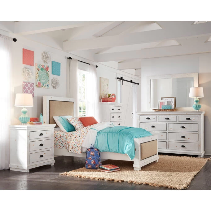 The Willow upholstered headboard will fit right in to your country or vintage themed bedroom. Made of pine solids with a hand-applied, rough-hewn finish that mimics salvaged wood, it has an authentic flea market look that’s softened by the padded linen-inspired polyester upholstery and nailhead trim. You’ll love it with a handmade quilt or a cozy down comforter. Accent this bed with matching pieces, metal, or your own found treasures.
